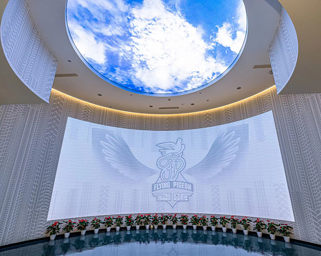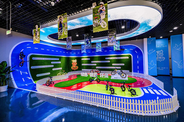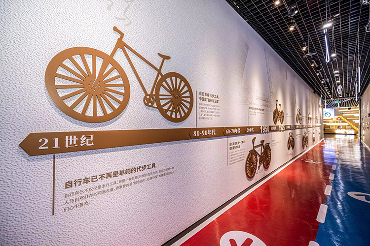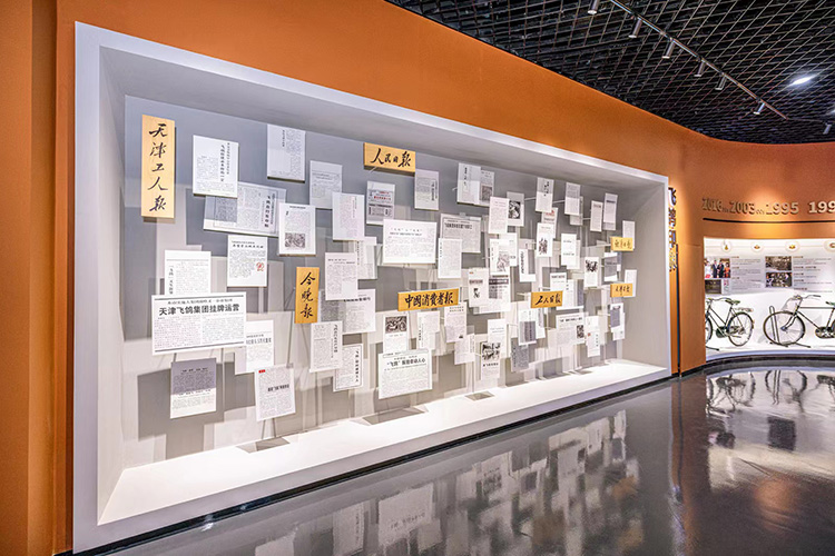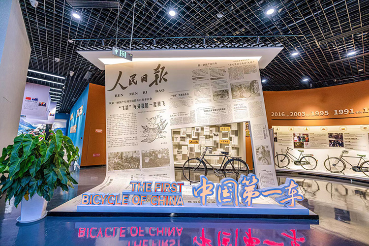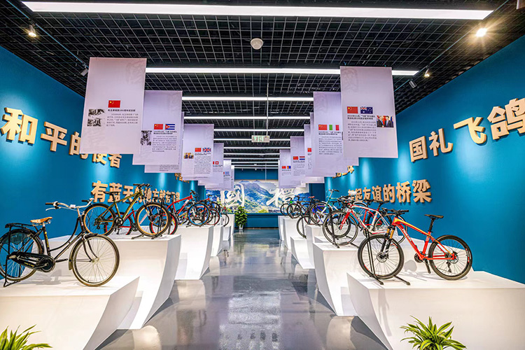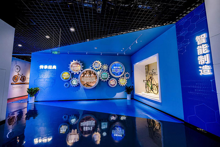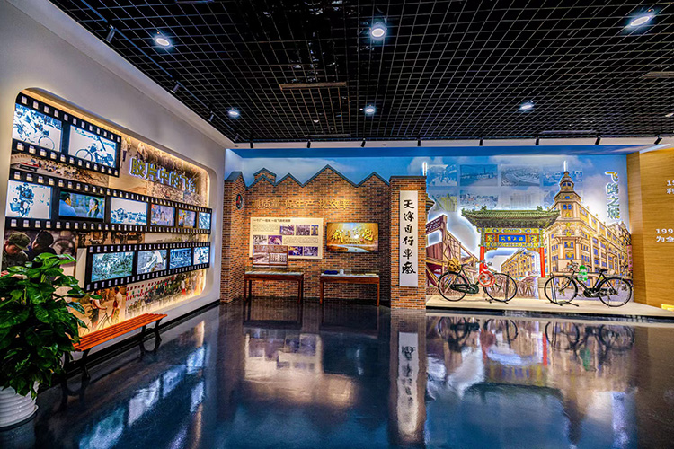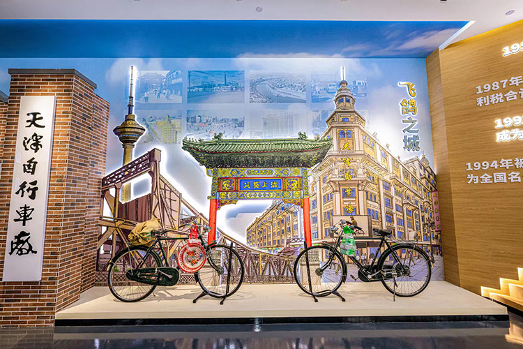 飞鸽品牌文化馆位于梅江会展中心,展厅总面积1150平方米,分为前厅、序厅、民族品牌、国礼飞鸽、时代记忆、守正创新、蓝色梦想七大篇章,是一座承载着天津工业文明记忆的城市会客厅,是面向全国开放的飞鸽自行车品牌文化交流中心